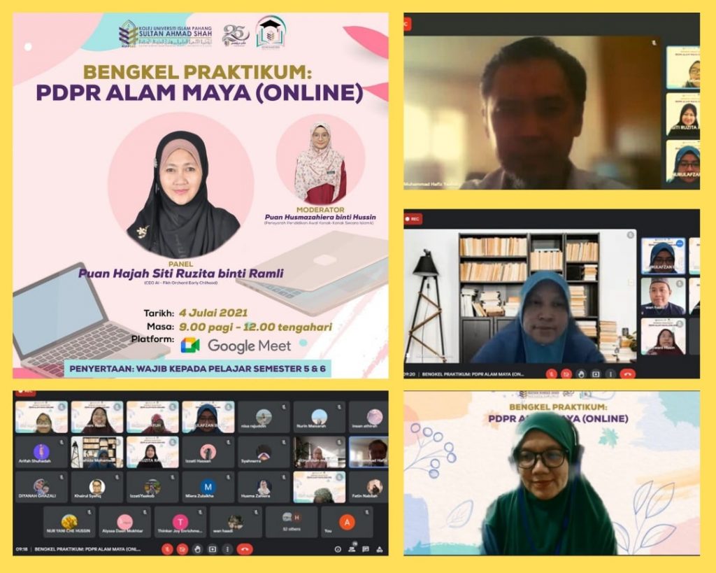4 Julai 2021 – Bengkel Praktikum: PDPR Alam Maya (Online) telah berjaya dilaksanakan melalui platform google meet bersama panel jemputan iaitu Panel Penasihat Industri Program Diploma Pendidikan Awal Kanak-Kanak Secara Islamik (DPAKSI) Puan Hajah Siti Ruzita Ramli, pengasas Al-Fiqh Orchard.